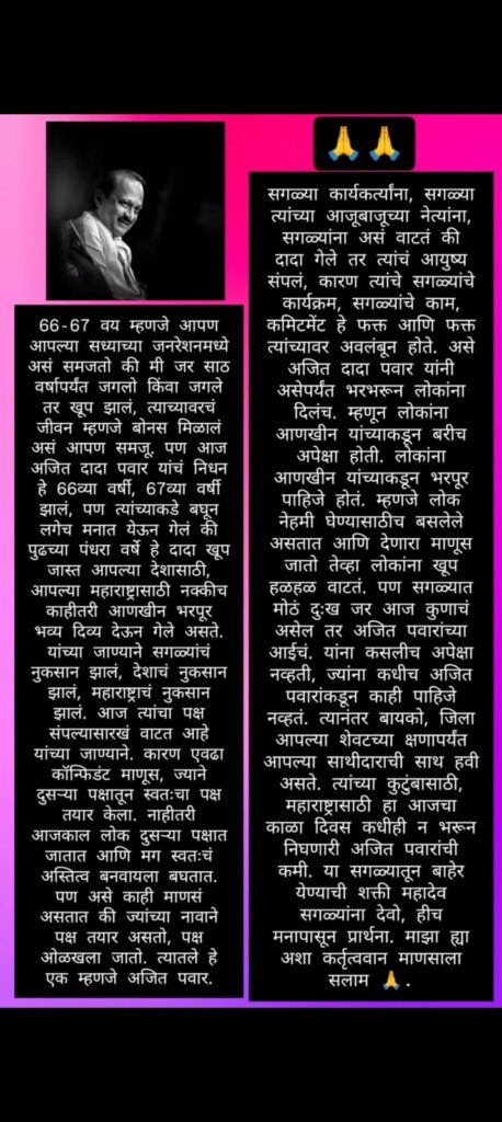 All workers, all their leaders, and all those who voted for Dada feel that his life was full of programs, work, and commitment, which only rested on him. Ajit Dada filled people with inspiration. People expect blessings and full support from such people. People need to take from those who are always ready to give. So people feel very sad. If anyone has any pain today, it is Ajit Pawar’s loss. He had no personal desire; people never wanted anything from Ajit Pawar. After him, women, district people, are with their companions in their last moments. For their family and Maharashtra, this black day will never be forgotten – Ajit Pawar’s loss. May Mahadev give all the strength to go out of this sorrow. I pray with folded hands to such a great person. Salute 🙏🏼.
